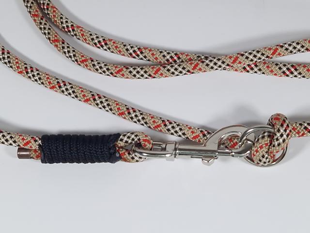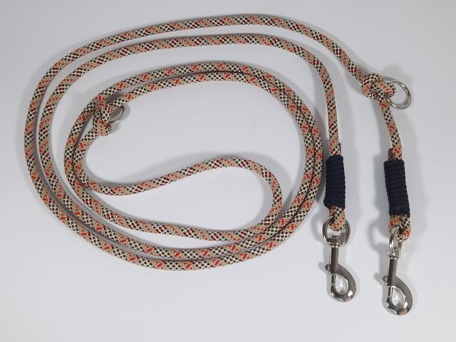 Die Knotenleine hat eine minimale Länge von 170cm und die maximale Länge beträgt 330cm. Sie ist mit zwei Knoten ausgestattet, an denen die Ringe zur Längenregulierung befästigt sind. Diese beiden Knoten können schnell an eine andere Position gebracht werden, um die Wunschlänge für den Hundebesitzer ideal zu regulieren.