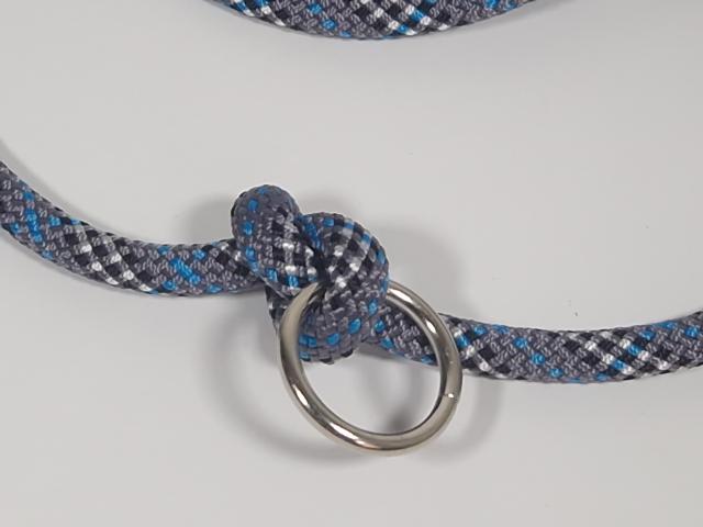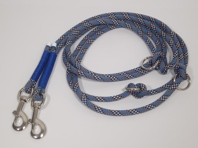 Die Knotenleine hat eine minimale Länge von 170cm und die maximale Länge beträgt 330cm. Sie ist mit zwei Knoten ausgestattet, an denen die Ringe zur Längenregulierung befästigt sind. Diese beiden Knoten können schnell an eine andere Position gebracht werden, um die Wunschlänge für den Hundebesitzer ideal zu regulieren.