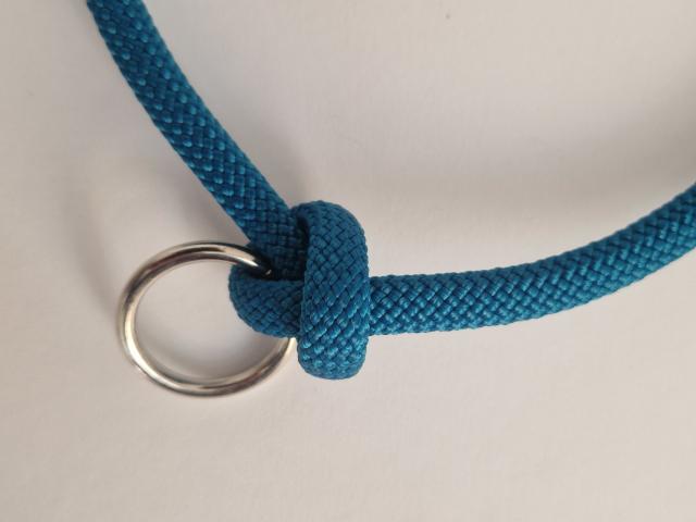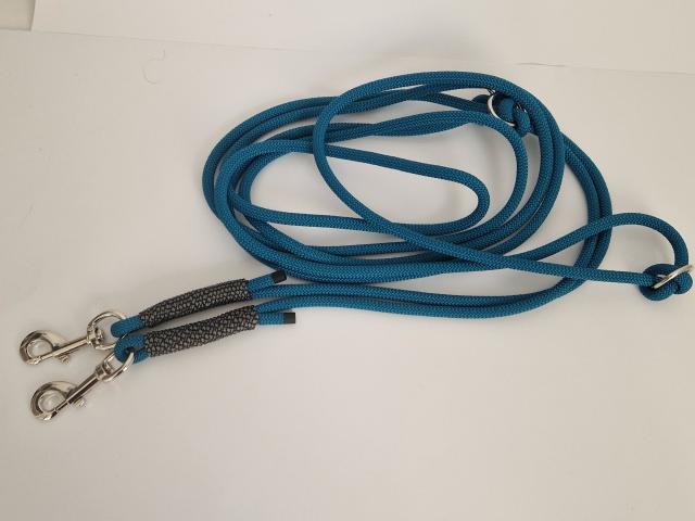 Die Knotenleine hat eine minimale Länge von 240cm und die maximale Länge beträgt 480cm. Sie ist mit drei Knoten ausgestattet, an denen die Ringe zur Längenregulierung befästigt sind. Diese drei Knoten können schnell an eine andere Position gebracht werden, um die Wunschlänge für den Hundebesitzer ideal zu regulieren.
